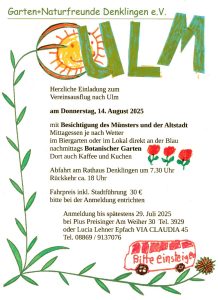Ganz herzlich laden wir alle Mitglieder und Interessierte am Donnerstag, 14. August 2025, zu unserem Vereinsausflug nach Ulm ein. In dieser wirklich sehenswerten Stadt bekommen wir eine Führung durch die Altstadt mit anschließendem Mittagessen in einem Lokal direkt an der Blau und am Nachmittag gibt es noch viel zu sehen im Botanischen Garten der Universität, wo wir uns auch mit Kaffee und Kuchen stärken können. Wir freuen uns wieder auf zahlreiche Teilnahme wie letztes Jahr.