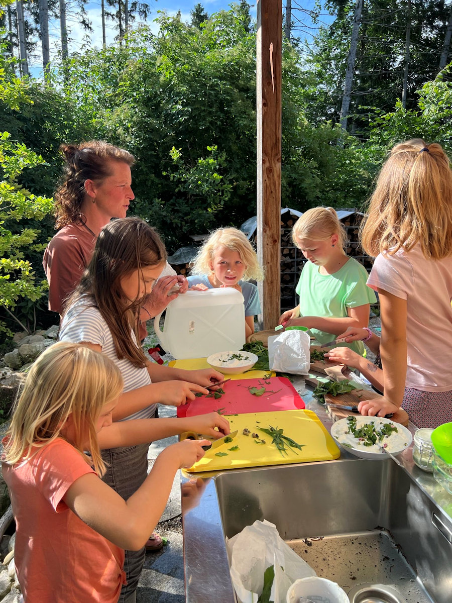 "Meine Wilden Kräuter" ... ... unter diesem Motto kamen wir im Mai, nachdem uns der Wetterfrosch wieder Regen und Gewitter gemeldet hatte, mit unserer Waldgeistergruppe zum Frühlingstreffen bei Juliane und Christian im wunderschönen "Hirsch-Garten" zusammen. Unsere diesjährige Kindergruppe lernte 8 wilde Kräuter kennen und sammelte und beklebte damit eifrig ihre Kräuterbüchlein. Die unterschiedlichen Merkmale und Geschmäcker von Bärlauch, Löwenzahn, Frauenmantel, Spitzwegerich, Schafgarbe, Gundermann, Vogelmiere und Giersch wurden genau betrachtet und teilweise auch probiert. Wir setzten unseren "Wiesendudler" mit Giersch, Gundermann, Holunderblüten und Minze an und nach einer guten Stunde Ziehzeit genossen wir unsere feine Kräuterlimonade. Mit vereinter Muskelkraft bereiteten wir uns eine Kräuterbutter aus Sahne und knackigen Bärlauchsamen zu, dazu gab es Frühlingsquark und Kräuterbrote. Anschließend bastelten wir noch schicke Blütenarmbänder und "Wiesenkanonen" aus Spitzwegerichblüten wurden abgefeuert. Am Abend kam ein zweiter Gewitterregen und wir verzogen uns unter das Vordach, um mit Pflanzenkohle noch ein paar Kunstwerke zu zeichnen. Mit schwarzen Kohlefingern und Bärlauchsalz entließen wir unsere Waldgeister in die Pfingstferien. Auf ein Sommertreffen freuen sich Conni, Hanna, Juliane und Christian |