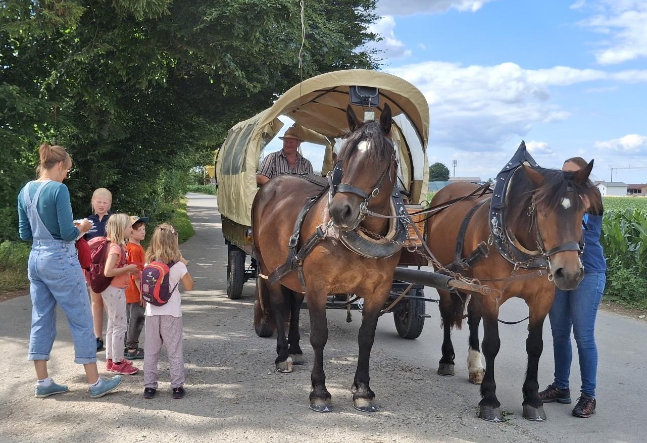 Familie Hefele spannte für uns ihre Pferde ein und in einer fröhlichen Kutschpartie ging`s quer durch die Denklinger Fluren. Beim